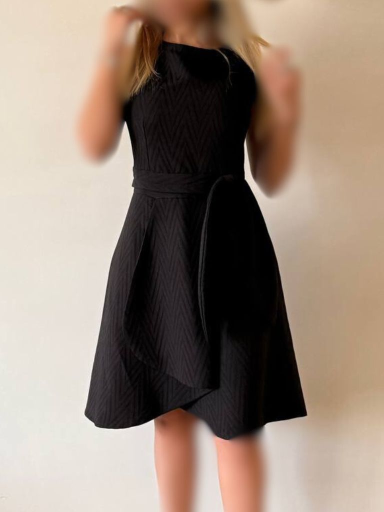 یقه گرد ، دارای برش در دامن ، دارای کمربند گره خور به شکل گل